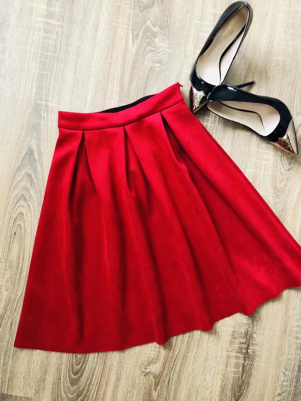 Спідниця красивого червоного кольору Экозамш. Стан відмінний Одягала кілька разів. Талія 32 см ( збоку на замку ) Довжина 56 см