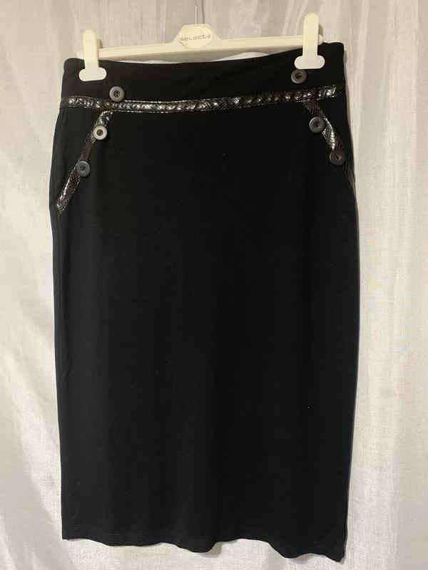 Спідниця трикотажна з декоративними гудзиками і оздобленням. Заміри: довжина - 72см., ПІТ - 42см., ПОБІДИ - 53см.