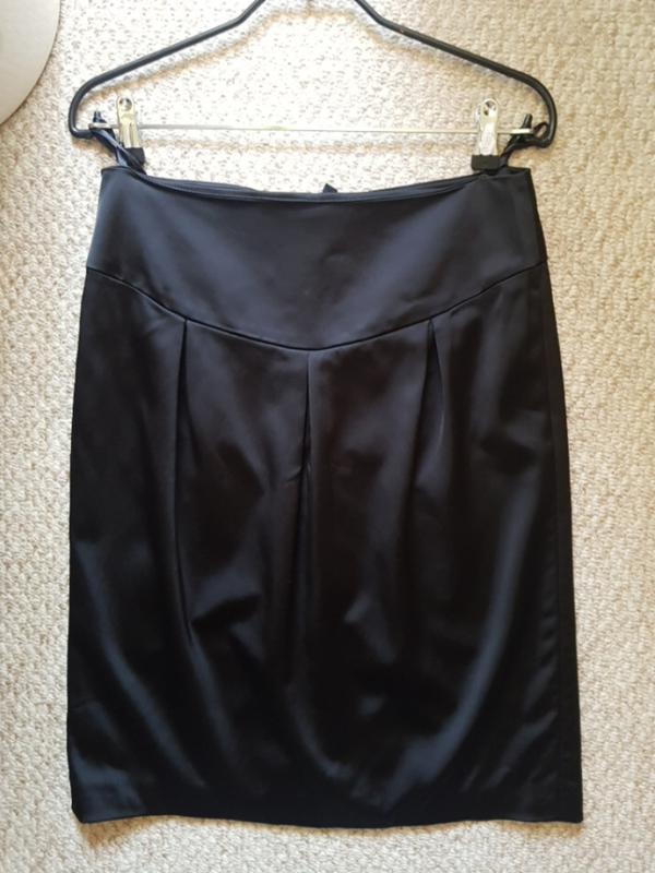 красивая чёрная юбка на подкладке .Имеет кокетку и три встречные складки . Выгодно подчёркивает фигуру ,делает плоским животик . Не тянется . Материал плотный с отливом . Размер указан европейский 38 но по факту лучше сядет на 36.