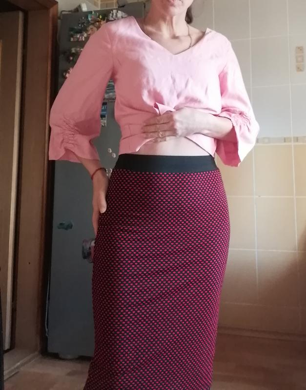 відмінний стан в талії резиночка для всіх сезонів тканина середньої щільності тягнеться, по фігурі довжина за коліно на підлозі фото не підігнута ніде блуза ніжно-рожева також у продажу( якість бавовна, як льон) як нова на фото параметри 72-96, 165 довжина 66 піт 32-37 побіди 45-50