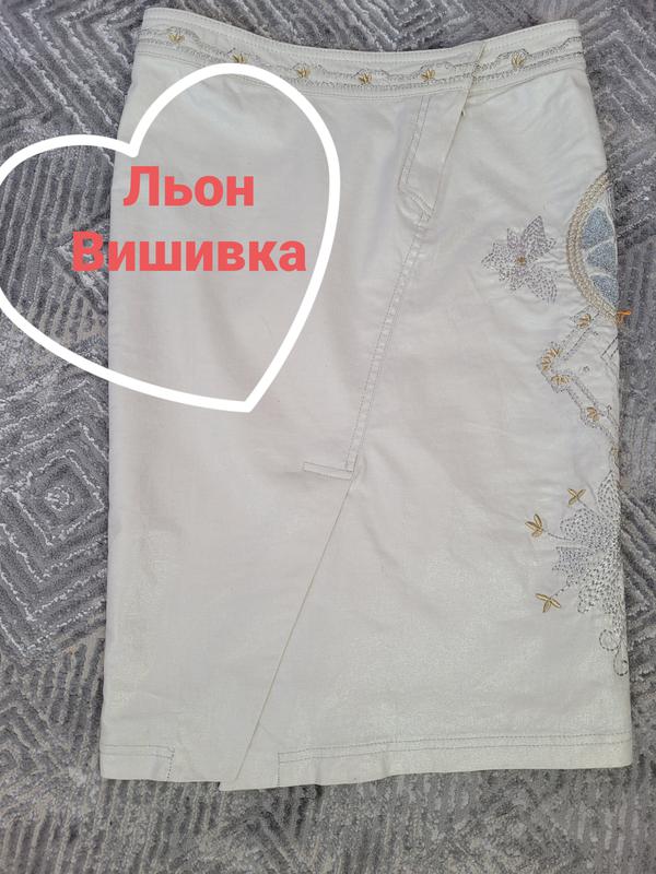 Спідничка фірми BALIZZA, 36розмір, колір бежевий з гарним срібним відблиском. Склад: 53%Льон, 43%котон 04% поліуретану. Заміри дивіться на фото, тканина трішки тягнеться, вишивка срібно-золота збоку і на поясі