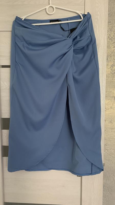 Спідниця небесно-блакитного насиченого кольору. Гарний розріз, цікаве пошиття.