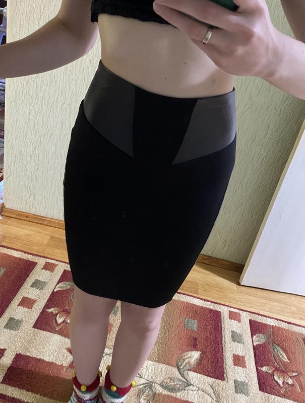 Дуже якісна спідниця з шкіряними вставками, тканина плотна, приємна на дотик, без дефектів, на замочку, дуже класно тянеться та сідає по фігурі