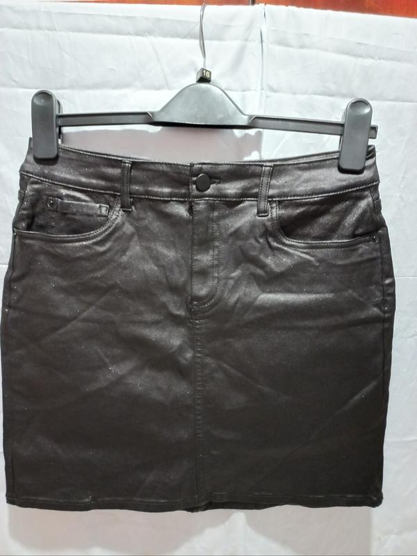 Спідниця чорного кольору з блискучою крапкою, добре тягнуться, в гарному стані, розмір 10, склад на фото. Заміри: по талії 38 по бёдрам 46+ довжина 46. При покупці 2 і більше речей скидка.