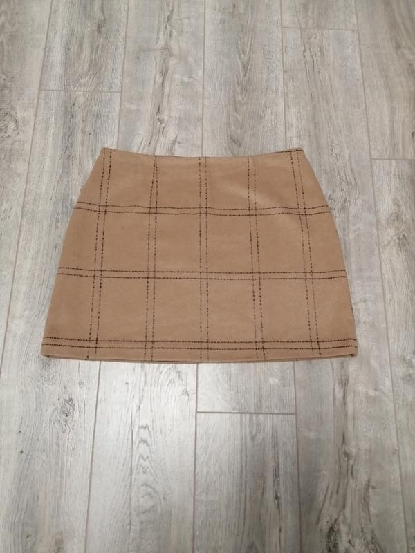 Жіноча бежевого кольору в крупну клітинку, міні спідниця на підкладці. Розмір 16. Склад поліестр, акрил, шерсть, нейлон, віскоза. В ідеальному стані, не тягнеться,плотна, якісна. Всі заміри на фото.