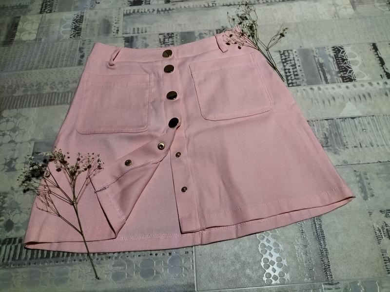 Спідниця на закльопках спереду з карманами (тканина - щось на подобі джинсу), трішки розкльошонна ✓нова ✓колір- рожевий💕 ✓розмір 42-44 ОТ 70 ОБ 88-94 Довжина 37