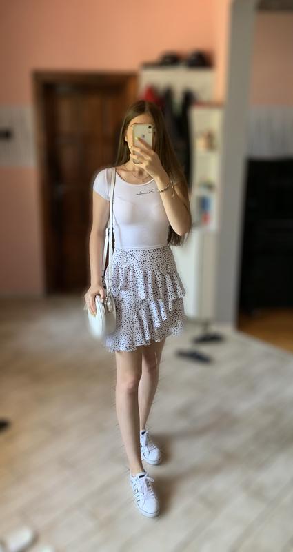 Біла спідниця у розмірі XS. Має підклад, не просвічується. Спереді на талії рівний крій, ззаді на резинці, за рахунок чого добре тягнеться. Вище коліна, саме те на літо.