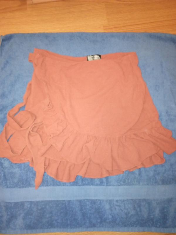 Спідниця із заходом, з оборкою, розмір вказаний М, обхват талії регулюється поясом, довжина 50 см