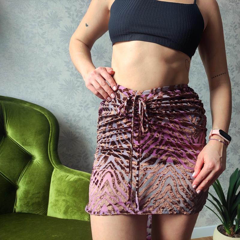 Стильна, цікава спідничка на дівчину XS-S, затягується попереду. Напівобхват талії 32 см Напівобхват стегон 40 см Довжина 37 см