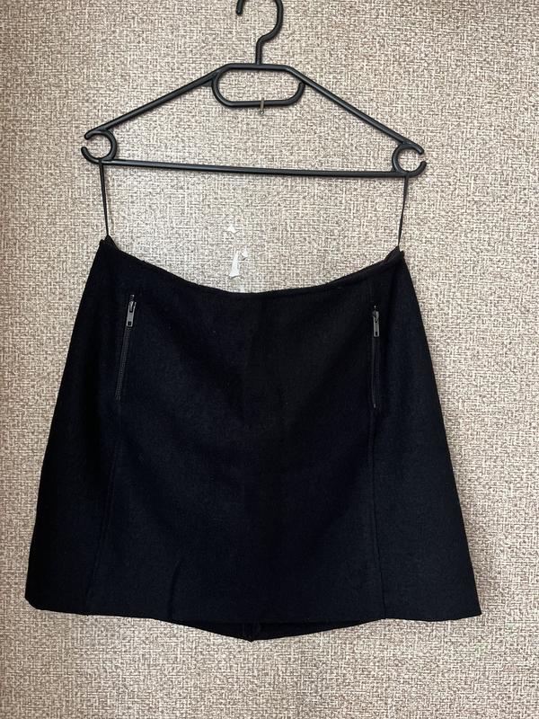 Спідниця чорного кольору із шерстяної тканини, є підкладка, гарно тримає форму. Заміри: ПОТ-45, ПОБ-53, довжина-40 см