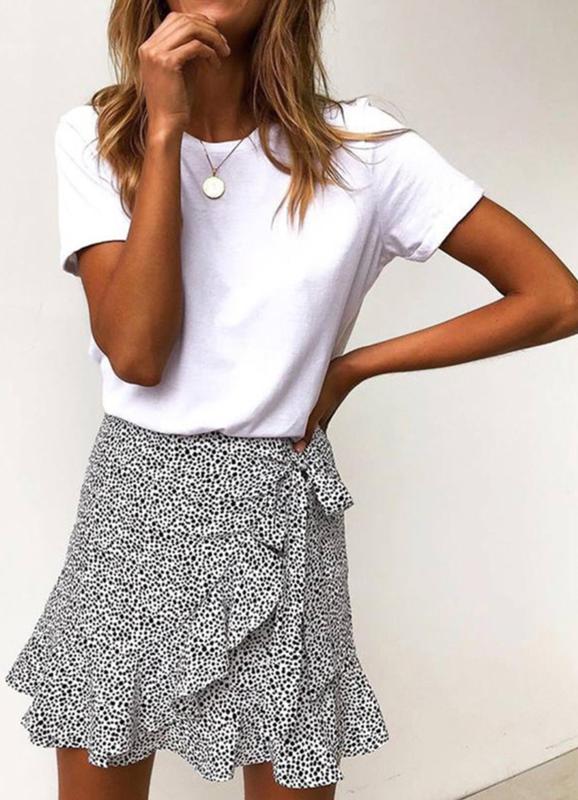 Стан ідеальний!!! Стильна,коротка, гарна,трикотажна спідничка з імітацією на запах Довжина- 41см Талія на резинці тягнеться ПОТ - від 34см до 50см тягнеться ПОБ- в спокійному стані 52см і тягнеться на більше Спідничка з імітацією на запах, тобто вона зшита, але здається,що ні В дійсності дуже гарна!