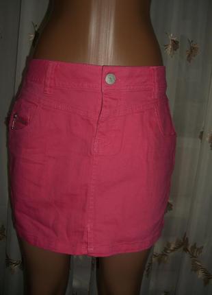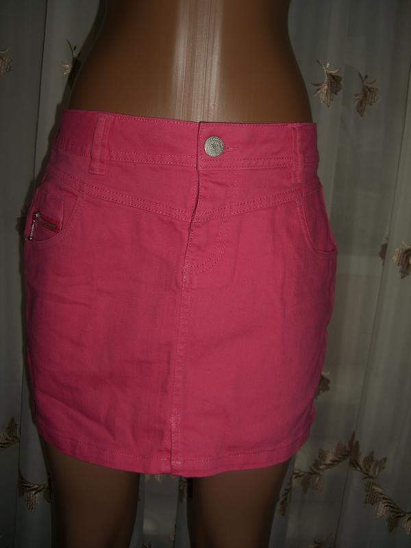 спідниця джинсова рожевого кольору, пояс під ремінець, попереду по боках кишені, ззаду теж дві кишені, застібається попереду на блискавку і гудзика, коротка довжина