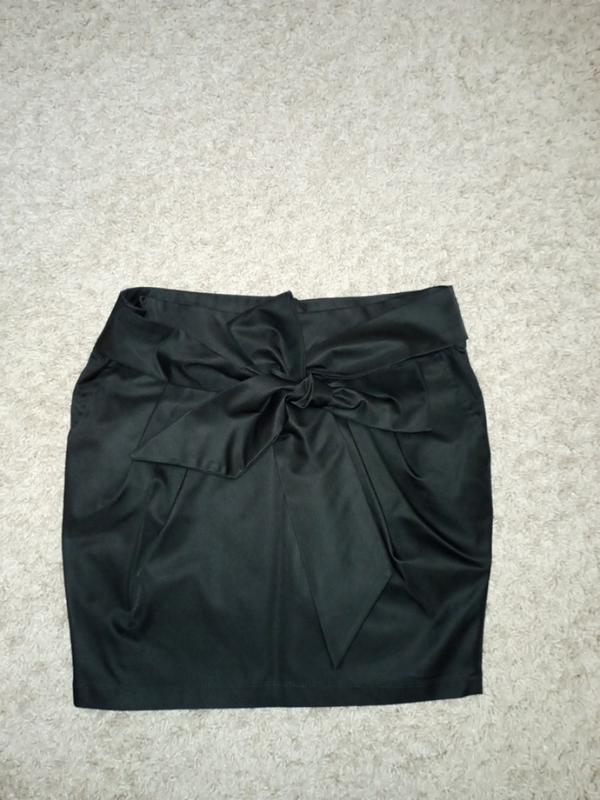 в ідеальному стані насичено чорна, тканина за стрейчем , тягнеться ніби брючна трохи блистить, але не атлас... Бант можна зав'язувати також ззаду. талія 40 бедра 48 низ 42 довжина 43