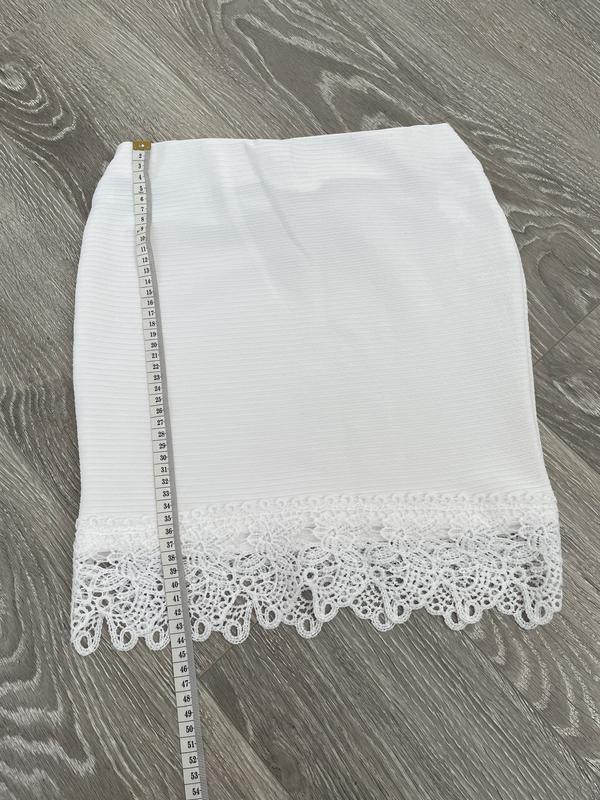 Нова біла спідниця міні, декорована мереживом, на резинці розмір S, всі заміри на фото
