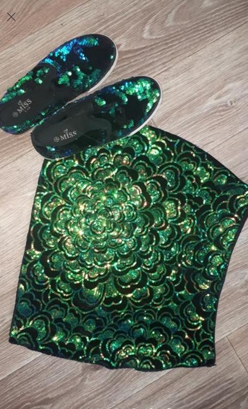 Міні спідниця і мокасини декоровані блискучі зелені.