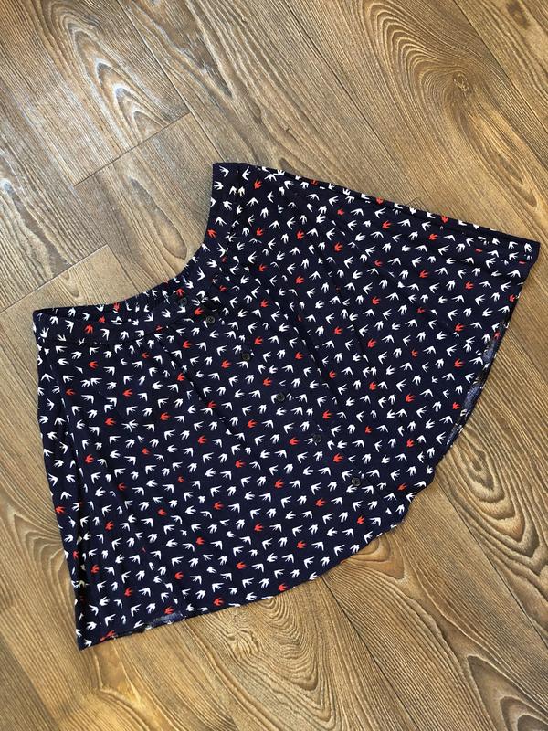 Короткая синяя юбка с белыми и красными ласточками. Очень легкая. Размер 34/36, на XS/S. Сзади на поясе резинка. Длина 37 см. P.S. При покупке двух или более вещей из моей страницы, будет скидка на всю сумму покупки☺️