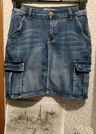 Джинсова спідниця з накладними кишенями. Тканина плотна та єластична , добре тягнеться і в поясі і по бедрам. Всі кишені на кнопках. Талія 34см тягнеться на 40см Бедра 45см тягн.на 49см. Довжина 45см.