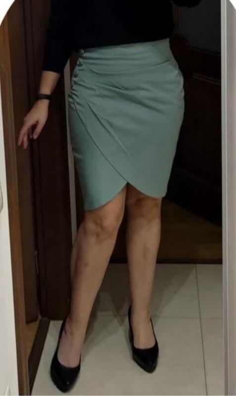 юбка тюльпан. не тяготится при росте 162 см. выше колена. на запах. сбоку драпировки и пуговицы. застегивается сзади на молнию. эффектный. цвет - бирюзовый/голубой. посадка из талии. размер С.