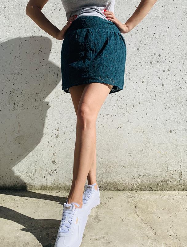 Короткое кружевесное юбка темно-зеленого (бирюзового) цвета. Не просвечивается (есть подкладка). Новая, с биркой. Рост модели 170см.