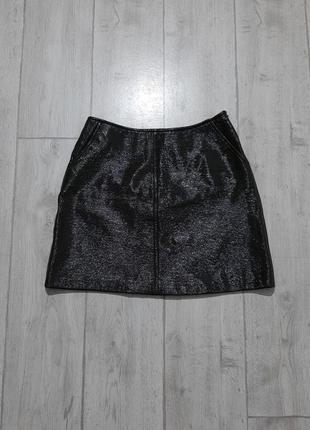 Лакована спідниця трапецевидного крою. Колір хаккі. Розмір М. Стан відмінний. Заміри: пояс 37, стегна 52, довжина 45.