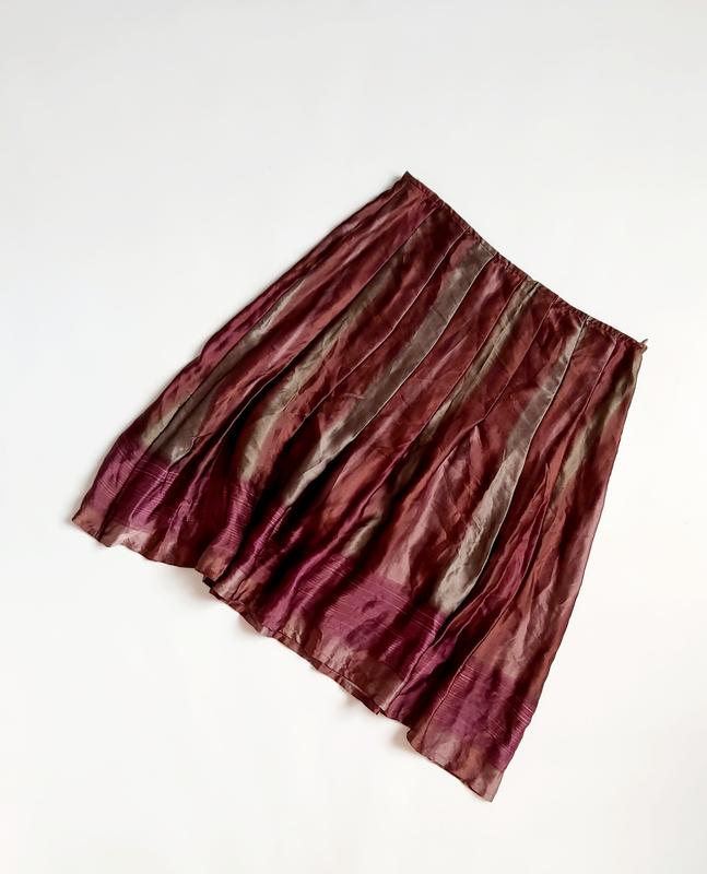Атласна спідниця в складу, колір темно бордо+ болотно зелений. Збоку скрита блискавка . Заміри: Ширина талії 36 см довжина вироба 54 см