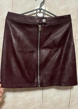 Шкіряна міні спідниця бордового кольору з масивною металевою блискавкою посередині ❤️