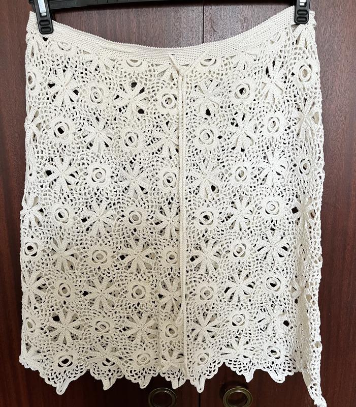 Вʼязана крючком. Нот 42 см, длина 62 см( по более длинному краю). По короткому 54 см