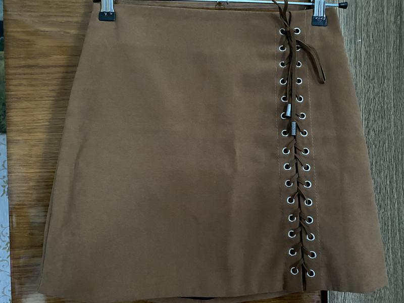 Спідниця з незвичайним дизайном, в розмірі S, в коричневому кольорі та в доброму стані. (довжина 38, талія-34, стегна-44, тягнеться)