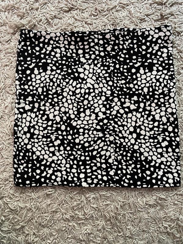 Спідниця міні трикотажна, чорного кольору в білі хаотичні плямки, має підкладку трикотажну чорного кольору, прямого крою. Розмір - S. Бренд - H&M.