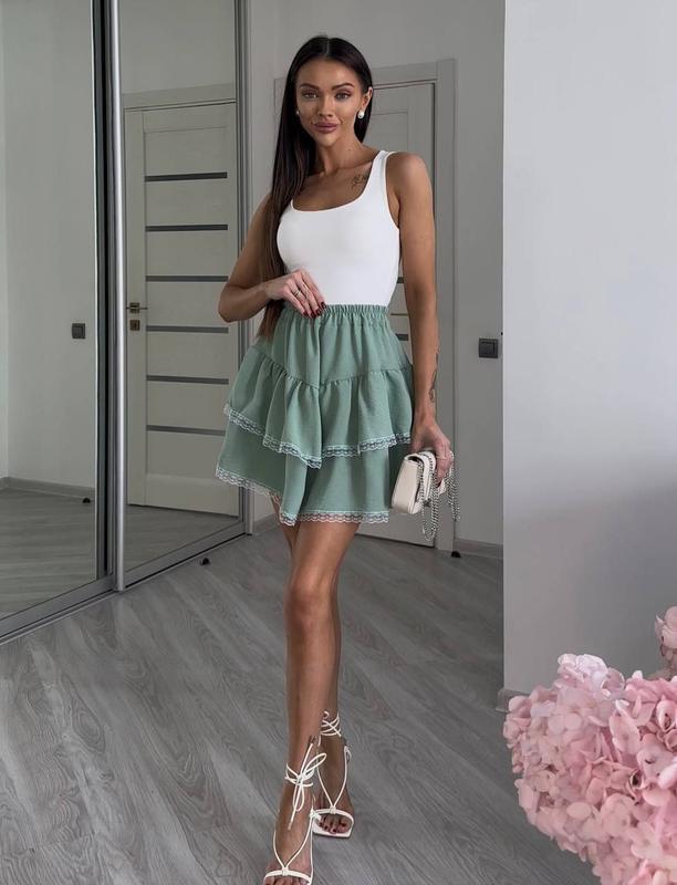 DaNi ▪️Модель: 1544 dress Ціна дроп 690 грн ▪️Тканина: креп жатка LUX ▪️Розмір: 42-46 (one size) ▪️Колір : фісташковий 💬 Тренд сезону 2024🔝 Невагома та легка спідниця «воланчики» з мереживом💖 Люкс якість👍 ФОТО РЕАЛ