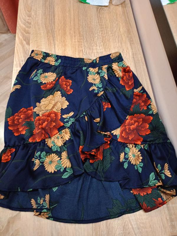 Дуже гарна яскрава спідничка з тканини типу атлас. Йде з переді на запах з воланом. Ні разу не вдягнена.