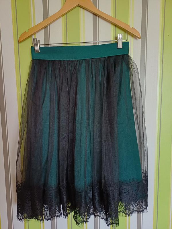 Спідниця 40 розмір з біркою. Гарне чорне мереживо / смарагдовий колір спідниці. Святкове