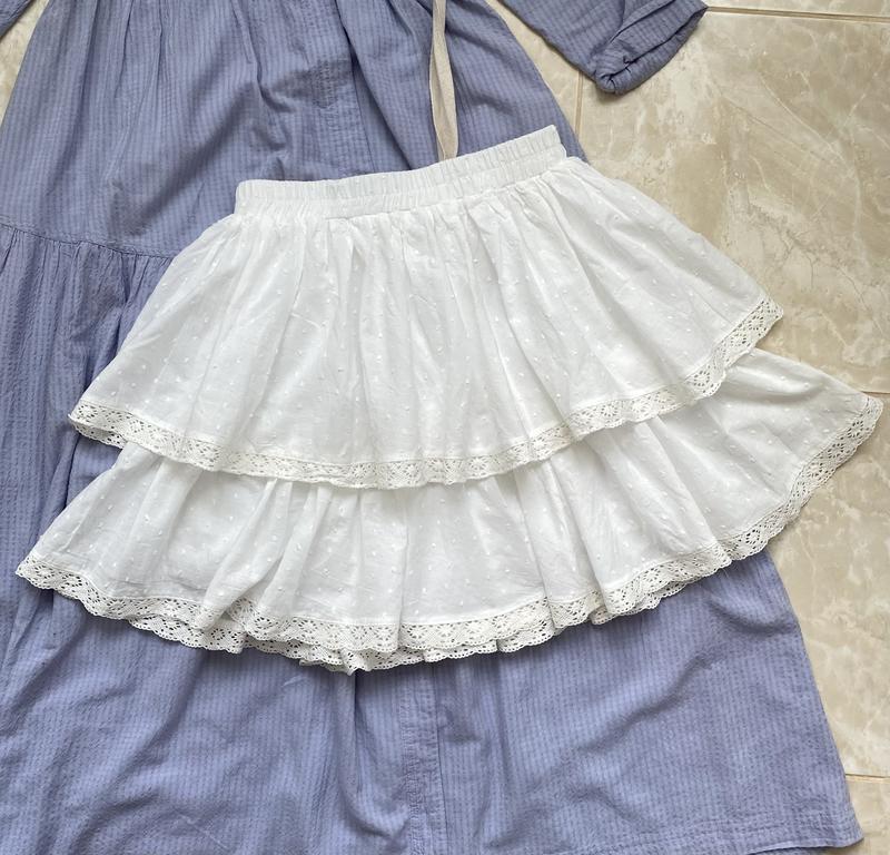 Біла мініспідниця з мереживом Розмір ХС-СМ Тканина 100% бавовна Не просвічується, підкладка є Бірок немає Стан ідеальний👌 Талия 31 ( тянется до 45) Длина 43 см