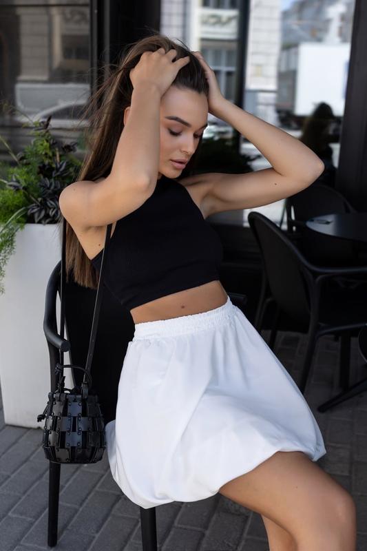 Спідниця-балон міні Ія Тканина: шовк MANGO Підклад: трикотаж масло Склад: 97% поліестер, 3%еластан, Підклад: 68% поліестер, 25% віскоза, 7% еластан Колір: білий, чорний, Розмір: S-M, L-XL Параметри моделі на фото Зріст: 163 см, ОГ: 86 см, ОТ: 64 см, ОС: 93 см. На фото на моделях представлена модель розмір S-M Комплектація: спідниця Фактичні виміри виробу: Об'єм по талії: S-M-60/75; L-XL- 64/79; Об'єм по стегнах (заміри по підкладці): S-M-100/104; L-XL- 104/108; Довжина виробу по боку: S-M-43; L-XL- 43;