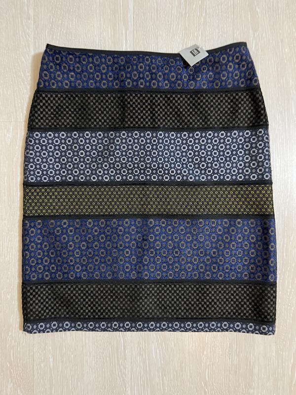 В наявності спідниця фірми M&S. Розмір вказаний 10. Склад: 38% віскоза, 41% поліестер і 21% акрил. Ширина в поясі — 39 см Ширина в стегнах — 48 см Довжина — 54 см