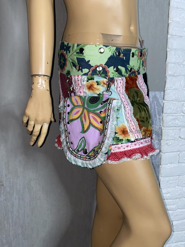 Міні-спідниця з зʼємною кишеньою-сумочкою на кнопках мініюбка на запах в стилі петчворк Moshiki. Довжина 31см, ПОТ 40-54см, ПОБ 50-64