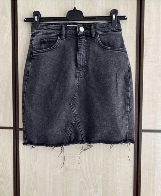 Джинсова мініграфітового кольору з додаванням стрейчу. Довжина 44 см, по поясу 31, тягнеться до 34, по стегнах 40, по низу 42, тягнеться на 6-7 см
