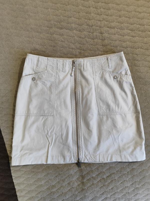 Коротка спідниця. Стилізована фурнітурою у вигляді замочка вздовж всієї довжини та кишені ( їх немає),. Легка, зручна, стильна. Тканина дуже легка по відчуттях, зручно на відпочинку чи роботі влітку.