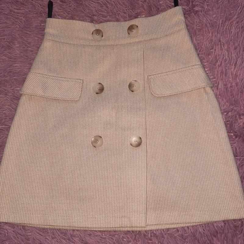 Короткая, теплая юбка с имитацией запаха. Стан идеален. Замеры: Длина 44, Полуобхват талии 32 Полуобхват бедер 44 Полуобхват самой нижней точки 50. Ткань немного тянется.