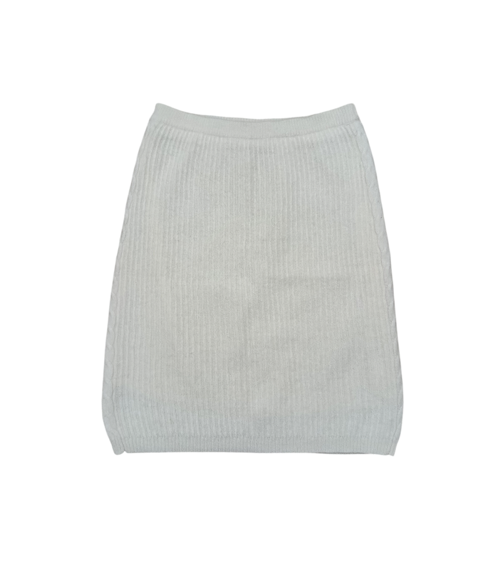 Юбка молочного цвета, по бокам вязка - косы, сверху резинка, юбка на подкладке. 70% вовна, 20% ангора, 10% нейлон. Длина - 51,5 см, полуобхват в талии - 33,5 см + тянется, полуобхват по бедрам - 43 см.
