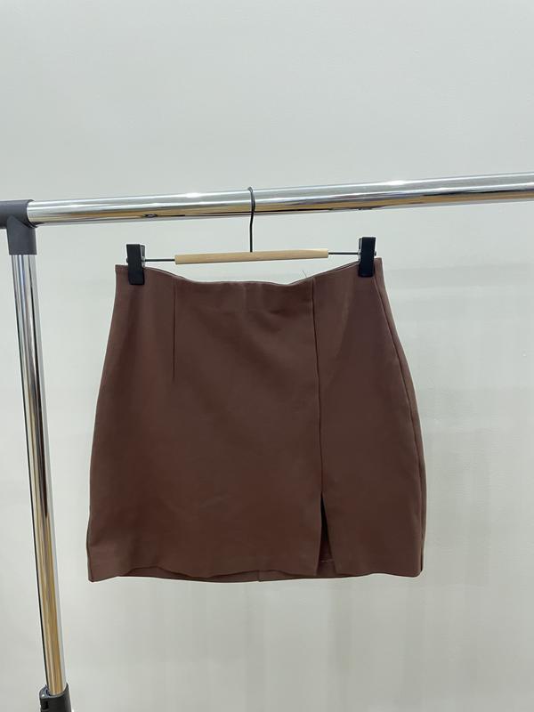 Міні-спідниця коричневого кольору Stradivarius, має виріз спереду, розмір М, стан хороший, на резинці, гарно сідає по фігурі. 67% віскоза, 29% нейлон, 4% еластан. Довжина 38 см, обхват талії 34 см, обхват бедер 40 см