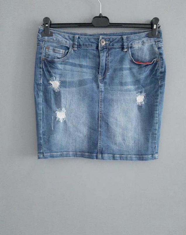Ним. 40, англ.14. Ширина в поясе-80-86 см Ширина бедер-96-104 см Длина-47 см Комфортный мягкий джинс, хлопок с эластаном. В синем цвете, с разрывами. Прямой силуэт, на молнии и пуговице, с карманом. Без дефектов, идеальный