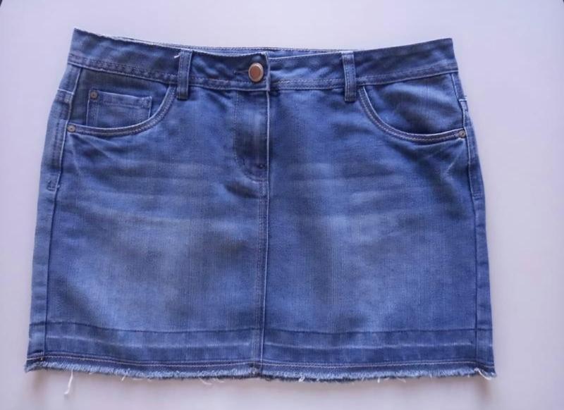 Коротка щільна спідниця, від відомого бренда George. Має передні та задні кишені, також є петлі для поясу. Застібається спереду на гудзик та блискавку. Сидить на талії. Джинс щільний , не тонкий, з потертостями. Приємний до тіла, трохи тягнеться. Колір: Блакитний Розмір по бірці: 12/40 М Заміри: Довжина виробу 38см Ширина по поясу 43см Ширина по бедрам 52см Півобхват низ 52см Склад тканини : 63%Бавовна, 37%Поліестер Стан ідеальний