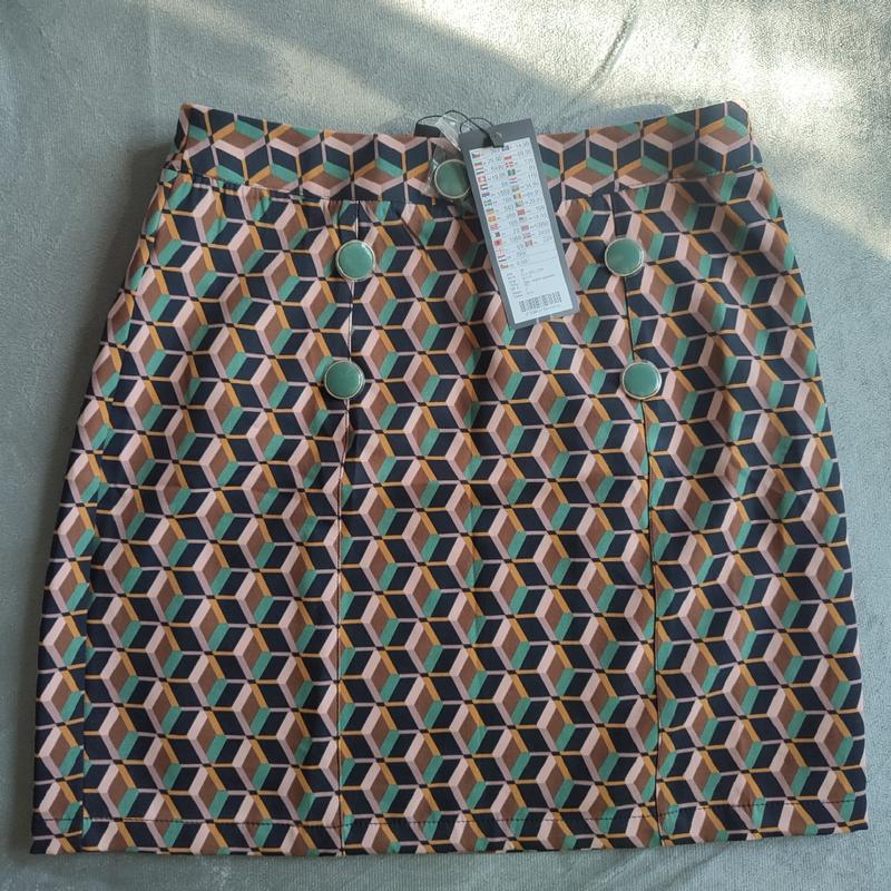 Нова стильна спідниця з асиметричним малюнком, приємна тканина . Підійде на укр.розмір 48 . довжина 45см., п/о стегон 48, п/о талії 36.
