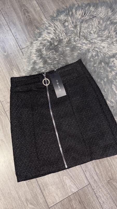 Нова спідниця Amisu Стильна чорна спідниця з фактурної твідової тканини. Акцент — срібляста блискавка спереду з кільцем - Розмір 36 - Колір чорний - Стан новий, з біркою