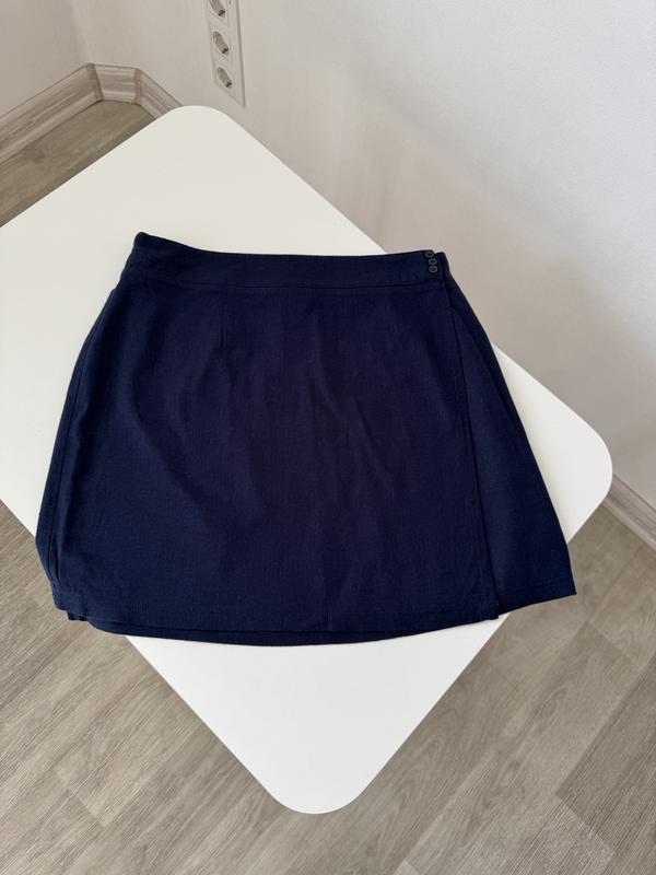 Спідниця синього кольору, довжини міні, зроблена на запАх Бірок немає, мабуть шили на замовлення, але це точно льон Довжина 42 см, напівобхват талії 38 см, напівобхват стегон 53 см Стан ідеальний