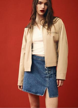Приталена міні спідниця H&M з бавовняного деніму.Одна сторона спереду зі шнурівкою та невеликим розрізом.Застібка-боискавка з однієї сторони.Нова,без бірки.Розмір EUR-40,US-8. ПОТ-39 Довжина-39 ПОБ-50