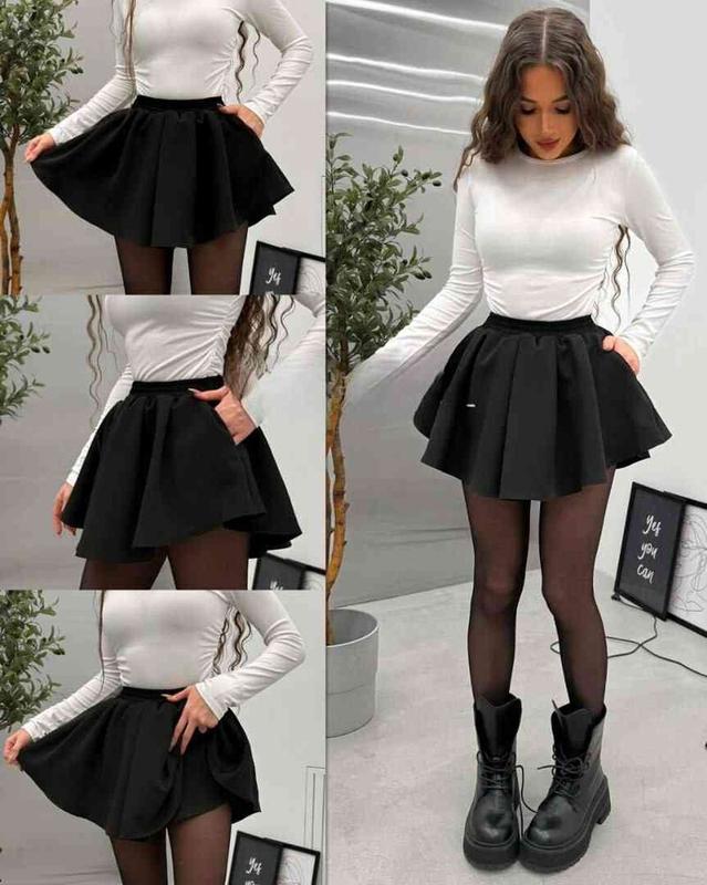 Стильна модель, яка виглядає як спідниця, але дарує повний комфорт шорт Ідеальна посадка, красиво тримає форму і не просвічує — база, яку носять постійно Тканина: щільна костюмка (не просвічує) Посадка: висока Силует: розкльошений Кольори: чорний Розмір: 42–44 ⸻ Заміри виробу + на які параметри підійде 42–44 ОТ виробу: ~64–68 см → на талію 62–68 см ОС виробу: до 94 см → на стегна 88–94 см Довжина виробу: ~38–39 см