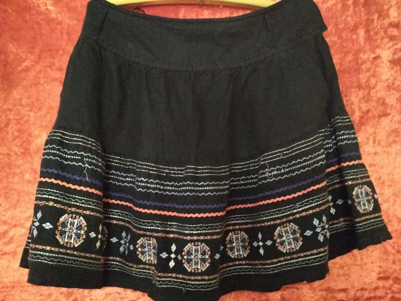 Спідничка в етнічному стилі. Всі замки і застібки робочі,є пару стирчать ниток (видно на фото,при носінні непомітно) ПІТ 40 ПОБІДИ 60 Довжина спідниці 47 Оплата на картку,доставка Нова і Укр пошти Обміну та повернення немає