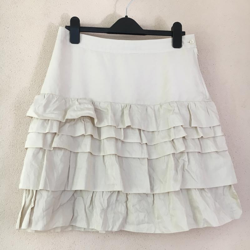 Легка,зручна,світло-бежевий колір,блискавка збоку,5 воланів, на підкладці. Заміри: довжина 48,2, ПІТ 37, ПОБІДИ 49,5.